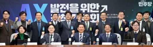 정청래 더불어민주당 대표와 김정관 산업통상부 장관 등이 20일 국회에서 열린 AX 발전을 위한 정책간담회에서 참석자들과 기념촬영을 하고 있다. <ⓒ투자가를 위한 경제콘텐츠 플랫폼, 아시아경제(www.asiae.co.kr) 무단전재 배포금지>