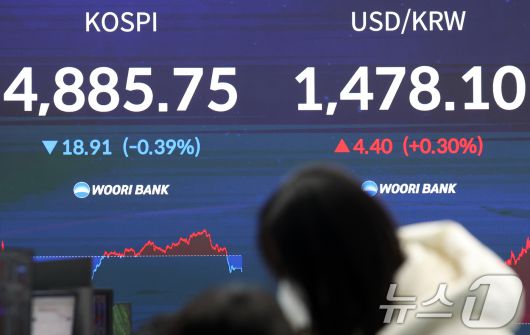 (서울=뉴스1) 김명섭 기자 = 20일 오후 서울 중구 우리은행 본점 딜링룸 전광판에 증시 종가가 표시되고 있다. 이날 코스피는 전 거래일 대비 18.91포인트(-0.39%%) 내린4,885.75, 코스닥은 9.01포인트(0.83%) 오른 976.37로 장을 마쳤다. 2026.1.20/뉴스1