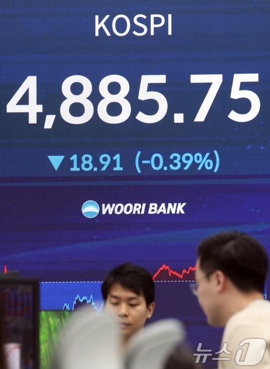 (서울=뉴스1) 김명섭 기자 = 20일 오후 서울 중구 우리은행 본점 딜링룸 전광판에 증시 종가가 표시되고 있다. 이날 코스피는 전 거래일 대비 18.91포인트(-0.39%%) 내린4,885.75, 코스닥은 9.01포인트(0.83%) 오른 976.37로 장을 마쳤다. 2026.1.20/뉴스1