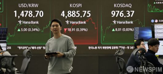 [서울=뉴스핌] 양윤모 기자 = 20일 오후 코스피가 전장 종가보다 18.91 포인트(0.39%) 하락하며 4885.75로, 코스닥은 8.01 포인트(0.83%) 상승한 976.37로 장을 마감한 가운데, 서울 중구 하나은행본점 딜링룸에서 직원들이 업무를 보고 있다. 서울외환시장에서 달러/원 환율은 전장 대비 5.00원 상승한 1478.70원에 주간거래를 마감했다. 2026.01.20 yym58@newspim.com