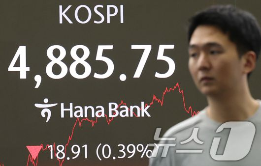 (서울=뉴스1) 오대일 기자 = 코스피가 12거래일 연속 상승세를 멈추고 숨 고르기에 들어간 20일 오후 서울 중구 하나은행 본점 딜링룸 전광판에 종가가 표시되고 있다. 이날 코스피는 전 거래일(4904.66) 대비 18.91포인트(0.39%) 내린 4885.75, 코스닥은 전 거래일(968.36)보다 8.01포인트(0.83%) 상승한 976.37에 장을 마쳤다. 서울 외환시장에서 원·달러 환율은 전 거래일(1473.7원)보다 4.4원 오른 1478.1원에 주간 거래를 마감했다. 2026.1.20/뉴스1