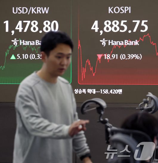 (서울=뉴스1) 오대일 기자 = 코스피가 12거래일 연속 상승세를 멈추고 숨 고르기에 들어간 20일 오후 서울 중구 하나은행 본점 딜링룸 전광판에 종가가 표시되고 있다. 이날 코스피는 전 거래일(4904.66) 대비 18.91포인트(0.39%) 내린 4885.75, 코스닥은 전 거래일(968.36)보다 8.01포인트(0.83%) 상승한 976.37에 장을 마쳤다. 서울 외환시장에서 원·달러 환율은 전 거래일(1473.7원)보다 4.4원 오른 1478.1원에 주간 거래를 마감했다. 2026.1.20/뉴스1