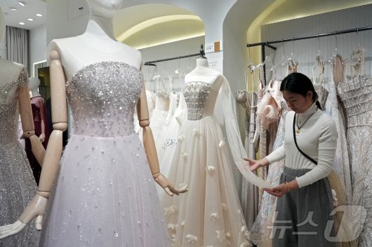 16일(현지시간) 중국 장쑤성 쑤저우의 한 웨딩드레스 판매상이 드레스 원단을 살펴보고 있다. 중국의 출생아 수가 지난해 사상 최저치를 기록하며 인구 감소가 4년 연속 이어지고 있다. 2026. 01. 16. ⓒ 로이터=뉴스1 ⓒ News1 양은하 기자 |
