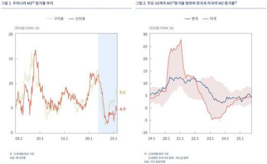 한은은 우선 '통화량(M2) 증가율이 최근 들어 과도하게 높아졌다'는 지적에 대해 일축했다. 통화량 증가율은 2020~2021년 중 코로나19 대응으로 11~12% 수준까지 높아졌다가 최근에는 4~5%대에서 등락하고 있다. 2024년 이후 다소 반등했지만 과거 평균에 비해 낮은 수준을 유지하고 있다고 한은은 짚었다. 주요 10개국과 비교해도 최근의 M2 증가율은 중간 정도에 해당한다. 또 일각에서는 우리나라의 증가율이 미국보다 높다고 주장하지만, 미국은 주요 10개국 중 가장 크게 변동한 국가라고 지적했다. 미국은 양적완화와 긴축에 따라 증가율이 최고 27%에서 최저 -5%까지 오르내리는 등 변동성이 컸다는 설명이다.