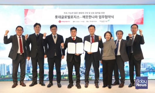 이번 협약식은 지난 19일 서울 송파구 롯데월드타워에서 진행된 가운데 깨끗한나라 최현수 회장, 이동열 대표, 롯데글로벌로지스 강병구 대표가 참석했다.