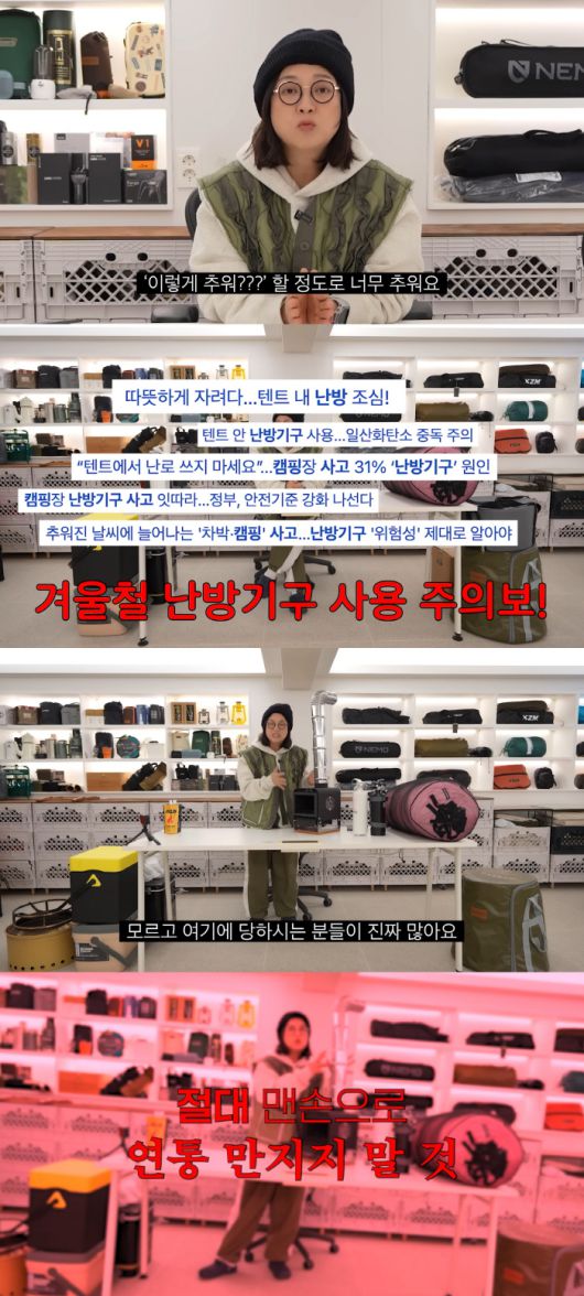 김숙은 캠핑 초보자들을 위해 겨울 캠핑 꿀팁을 소개하는 시간을 가졌다. 그는 "캠핑은 대부분 산 쪽으로 가니 엄청 춥다. 꼭 기능성 옷을 꼭 챙겨야 한다. 또 난방 기구 때문에 사고가 많이 난다. 화로대를 텐트 안에 들고 가면 절대 안 된다"라며 소화기도 지참하라고 알렸다.