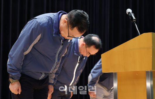 정희민 포스코이앤씨 대표이사가 인천 연수구 포스코이앤씨 송도사옥에서 고속국도 공사 현장 사망사고와 관련해 사과문을 발표 후 고개 숙여 인사하고 있다. 사진=뉴스1 |