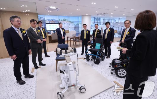 (서울=뉴스1) 박지혜 기자 = 20일 서울 강남구 역삼동 KB라이프타워에서 열린 보험·요양·은행 서비스를 결합한 '보험-은행 복합점포'인 KB골든라이프 플래그십 센터 개소식에 앞서 참석자들이 에이지테크랩을 둘러보고 있다. KB골든라이프 플래그십 센터는 보험 뿐 아니라 자산관리, 요양, 돌봄을 아우르는 원스톱 종합 라이프 컨설팅 서비스를 제공한다. 2026.1.20/뉴스1