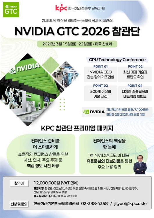 [파이낸셜뉴스] 한국생산성본부(KPC)는 오는 3월 16~20일 미국 캘리포니아주 새너제이에서 개최되는 'NVIDIA GTC 2026' 참관단을 모집한다고 20일 밝혔다.