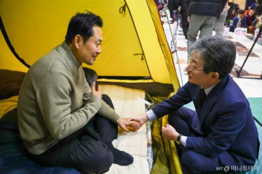 [서울=뉴시스] 김명년 기자 = 유승민 전 의원이 20일 오전 서울 여의도 국회 로텐더홀에서 통일교·공천헌금 '쌍특검'을 요구하며 엿새째 단식농성중인 장동혁 국민의힘 대표를 찾아 손을 잡고 대화하고 있다. 2026.01.20. kmn@newsis.com /사진=김명년 |
