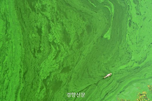 경북 고령 낙동강에 발생한 녹조 위로 물고기 한 마리가 떠다니고 있다. 경향신문 자료사진 |