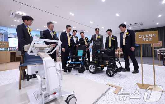 (서울=뉴스1) 박지혜 기자 = 20일 서울 강남구 역삼동 KB라이프타워에서 열린 보험·요양·은행 서비스를 결합한 '보험-은행 복합점포'인 KB골든라이프 플래그십 센터 개소식에 앞서 참석자들이 에이지테크랩을 둘러보고 있다. KB골든라이프 플래그십 센터는 보험 뿐 아니라 자산관리, 요양, 돌봄을 아우르는 원스톱 종합 라이프 컨설팅 서비스를 제공한다. 2026.1.20/뉴스1