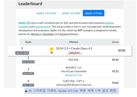 이는 지난해 7월 DBT(Data Build Tool) 부문 1위에 이은 성과다. 'Spider 2.0'은 AI가 사람 언어(자연어)를 데이터베이스 언어(SQL)로 얼마나 정확하게 변환하는지를 측정하는 지표다. 실제 기업 환경과 유사한 복잡한 데이터 구조를 다루기 때문에 글로벌 빅테크 기업과 유수 연구기관들이 기술력을 검증 받는 지표로 활용되고 있다.