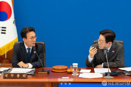 [서울=뉴스핌] 이재명 대통령이 20일 청와대에서 열린 제2회 국무회의에서 김민석 국무총리와 대화를 나누고 있다. [사진=청와대] 2026.01.20 photo@newspim.com