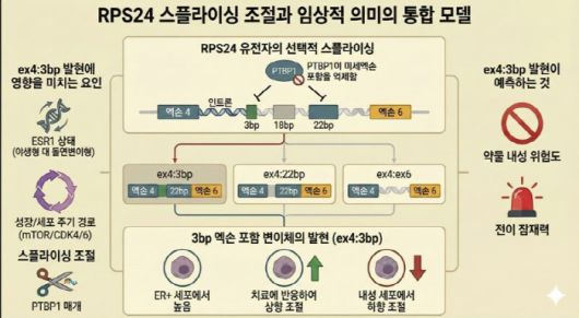 그 결과, RPS24 유전자의 여러 변이체(아이소폼) 중 'ex4:3bp'라는 변이체가 특정 유방암에서 뚜렷한 특징을 보인다는 사실을 확인했다. 특히 이 변이체는 에스트로겐 수용체 양성(ER+) 유방암, 즉 여성호르몬의 영향을 받는 유형의 유방암에서 특히 빈번하게 관찰됐다.