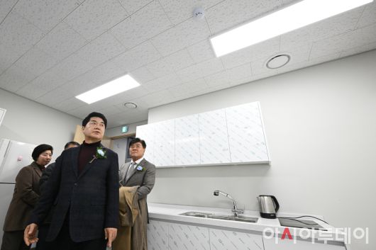 박준희 관악구청장이 20일 서울 관악구 미성동 복합청사에서 열린 개청식에서 청사 입구에 마련된 환경공무관실을 둘러보고 있다. 관악구는 2023년 8월 총사업비 181억여 원을 투입해 신청사 건립을 위한 첫 삽을 뜨고, 약 2년간의 공사 끝에 지난해 11월 행정?문화?복지 등 다양한 기능을 갖춘 미성동 복합청사를 완공했다. /정재훈 기자