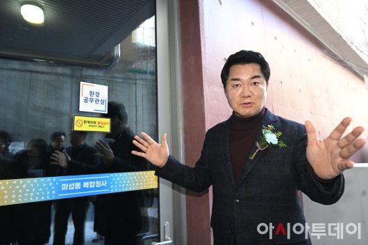 박준희 관악구청장이 20일 서울 관악구 미성동 복합청사에서 열린 개청식에서 청사 입구에 마련된 환경공무관실을 설명하고 있다. 관악구는 2023년 8월 총사업비 181억여 원을 투입해 신청사 건립을 위한 첫 삽을 뜨고, 약 2년간의 공사 끝에 지난해 11월 행정·문화·복지 등 다양한 기능을 갖춘 미성동 복합청사를 완공했다. /정재훈 기자