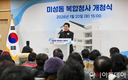 박준희 관악구청장이 20일 서울 관악구 미성동 복합청사에서 열린 개청식에서 인사말을 하고 있다. 관악구는 2023년 8월 총사업비 181억여 원을 투입해 신청사 건립을 위한 첫 삽을 뜨고, 약 2년간의 공사 끝에 지난해 11월 행정·문화·복지 등 다양한 기능을 갖춘 미성동 복합청사를 완공했다. /정재훈 기자