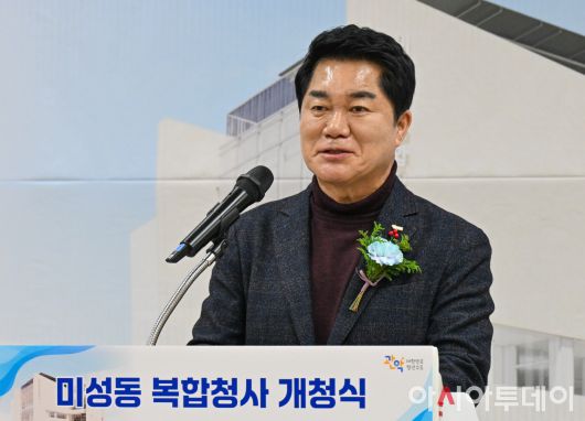 박준희 관악구청장이 20일 서울 관악구 미성동 복합청사에서 열린 개청식에서 인사말을 하고 있다. 관악구는 2023년 8월 총사업비 181억여 원을 투입해 신청사 건립을 위한 첫 삽을 뜨고, 약 2년간의 공사 끝에 지난해 11월 행정·문화·복지 등 다양한 기능을 갖춘 미성동 복합청사를 완공했다. /정재훈 기자