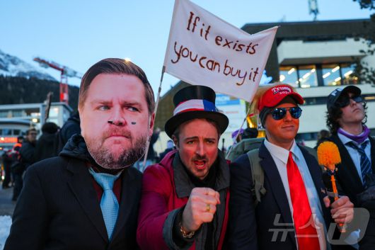 18일(현지시간) 세계경제포럼(WEF) 연차총회(다보스포럼)가 개최될 예정인 스위스 다보스에서 시위대가 도널드 트럼프 미국 대통령의 분장을 하고 JD 밴스 미국 부통령의 가면을 쓴 모습. 2026.01.18 ⓒ 로이터=뉴스1 ⓒ News1 김지완 기자 |