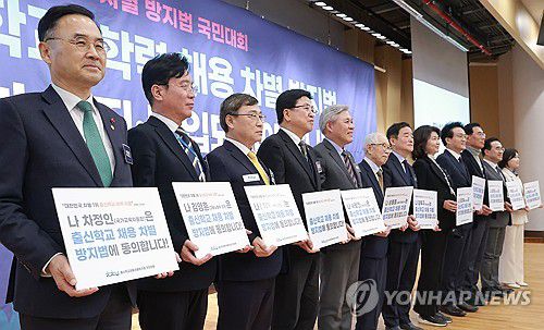 (서울=연합뉴스) 오보람 기자 = 기업이 직원을 채용할 때 출신학교를 볼 수 없도록 하는 법안 제정을 촉구하기 위해 시민단체와 정부 부처, 정치권이 뜻을 모았다.