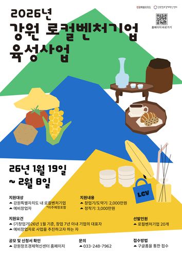 강원창조경제혁신센터는 지역 고유 가치를 비즈니스로 연결할 '2026년 로컬벤처기업 육성사업' 참여 기업을 오는 2월 8일까지 모집한다.