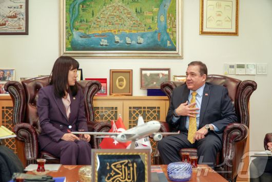(서울=뉴스1) = 강윤진 국가보훈부 차관이 20일 오후 서울시 중구 주한튀르키예대사관에서 열린 이달의 6.25전쟁영웅(타흐신 야즈즈) 선정패 증정식에 참석해 행사전 무랏 타메르 주한튀르키예 대사와 환담을 나누고 있다. (국가보훈부 제공. 재판매 및 DB 금지) 2026.1.20/뉴스1