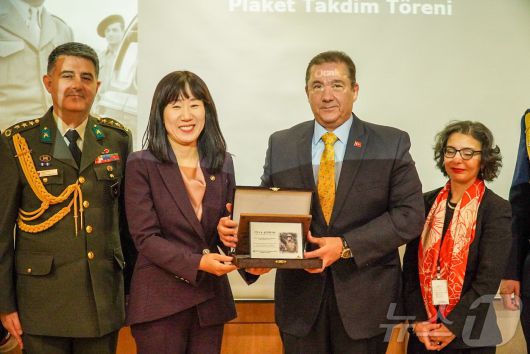 (서울=뉴스1) = 강윤진 국가보훈부 차관이 20일 오후 서울시 중구 주한튀르키예대사관에서 열린 이달의 6.25전쟁영웅(타흐신 야즈즈) 선정패 증정식에 참석해 무랏 타메르 주한튀르키예 대사에게 선정패를 수여하고 기념촬영을 하고 있다. (국가보훈부 제공. 재판매 및 DB 금지) 2026.1.20/뉴스1