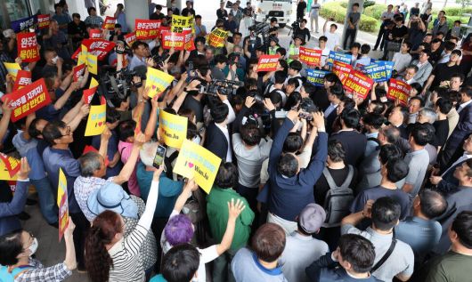 전북 완주군과 전주시의 지역 간 통합을 추진 중인 김관영 전북도지사가 2024년 7월26일 군민과의 대화가 예정된 완주문화예술회관 안으로 들어가려고 하자 통합 찬성과 반대 주민들이 몰려들어 손팻말을 들고 있다. 이날 군민과의 대화는 무산됐다. 연합뉴스 |