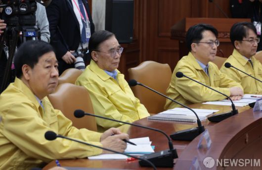 [서울=뉴스핌] 이길동 기자 = 이종석 국가정보원장(왼쪽두번째)이 20일 서울 종로구 정부서울청사에서 열린 제22차 국가테러대책위원회 회의에 참석해 김민석 총리의 모두 발언을 듣고 있다. 2026.01.20 gdlee@newspim.com