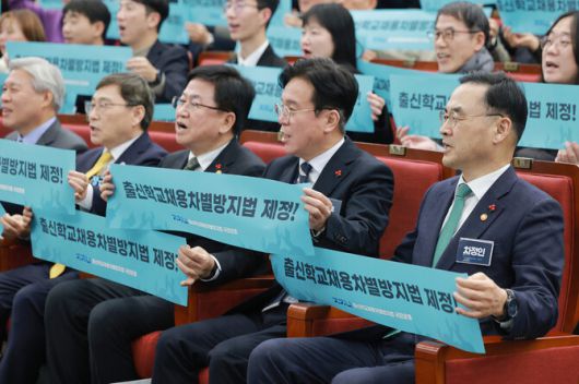 교육·노동 부처 수장들도 이날 행사에 참석해 입법에 힘을 실었다. 최교진 교육부 장관은 “채용절차법 개정안은 개인의 역량 발전을 지원하겠다는 교육 개혁 방향과 맞닿아 있다”며 “법안이 통과되면 왜곡된 공교육도 빠르게 정상화할 것”이라고 말했다. 김영훈 고용노동부 장관은 “관련 법률 주관 부처의 장으로서 법률 개정을 적극 지원하겠다”고 밝혔다.