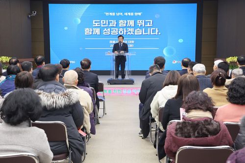 이번 방문의 핵심 일정인 '도민과의 대화'는 오전 10시 시청 5층 대회의실에서 시민과 공무원 등 350여 명이 참석한 가운데 성대하게 열렸다. 행사는 이학수 시장의 환영사와 올림픽 홍보 영상 시청, 올림픽 유치 기원 퍼포먼스 순으로 진행됐다. 이후 김 지사는 인사말과 특강을 진행했다. 특강 후 이어진 질의응답 시간에는 시민들의 건의 사항을 경청하고 답변하며 격의 없는 소통을 이어갔다.