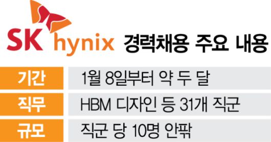 SK하이닉스는 이달 8일부터 총 31개 직군을 대상으로 경력 채용에 나서고 있다. 채용은 약 두 달 동안 진행될 예정이며 규모는 직군별로 10명 안팎인 것으로 전해졌다.