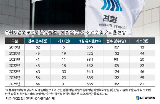 수원지검 연도별 기술유출 범죄 접수 건수는 2019년 32건(1심 유죄율 90.9%)에서 2020년 45건(72.2%), 2021년 41건(68.1%), 2022년 45건(93.3%), 2023년 63건(94.1%), 2024년 56건(88.9%), 2025년에는 84건(88.9%)으로 빠르게 증가하고 있다.