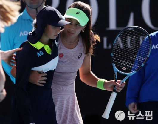 [멜버른 로이터=뉴스핌] 박상욱 기자=제이냅 손메즈가 18일 호주오픈 여자 단식 1회전에서 더위에 힘들어하는 볼퍼슨(왼쪽)을 부축하고 있다. 2026.1.19 psoq1337@newspim.com |