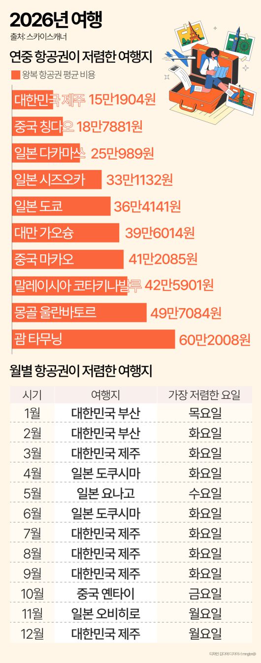 스카이스캐너가 '저렴한 여행지 플래너'를 통해 자사 검색 데이터를 기반으로 분석한 2026년 연중 항공권이 가장 저렴한 여행지는 '대한민국 제주'였다. 2위는 '중국 칭다오', 3위는 '일본 다카마쓰', 4위는 '일본 시즈오카', 5위는 '일본 도쿄' 등이었다.