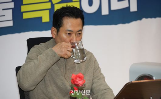 더불어민주당에 통일교·공천헌금 ‘쌍특검’ 수용을 요구하며 엿새째 단식 농성 중인 장동혁 국민의힘 대표가 20일 국회 로텐더홀에 마련된 농성장에서 물을 마시고 있다. 권도현 기자 |