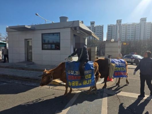 A씨가 몰고 온 소들의 등에는 ‘경찰, 검찰, 판사는 범죄자들. 국민은 누굴 믿고 사나’ 등의 문구가 적힌 현수막이 덮여 있었다.