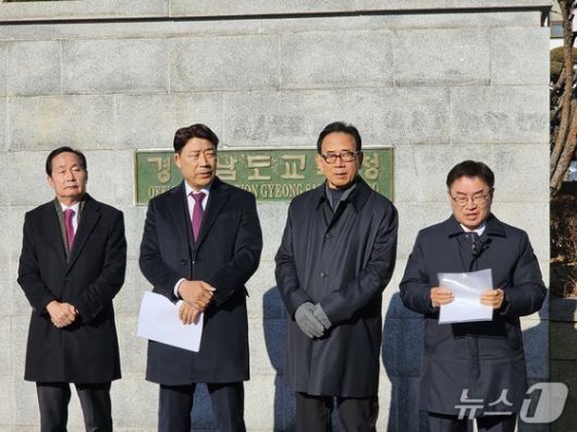 경남교육감 보수·중도 단일화 연대와 최병헌(맨왼쪽), 권순기(맨오른쪽) 후보가 12일 경남교육청 앞에서 기자회견을 열고 있다. 2026.1.12 ⓒ 뉴스1 박민석 기자 |