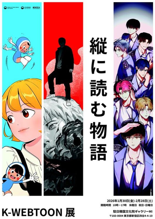 문화체육관광부와 한국콘텐츠진흥원(이하 콘진원)은 주일한국문화원과 함께 한국 웹툰의 창작성과 산업적 가치를 일본 현지에 소개하기 위해 '세로로 읽는 이야기: 2026 K-웹툰 전시(縦に読む物語 : K-WEBTOON展)'를 오는 30일부터 2월 28일까지 일본 도쿄 주일한국문화원 '갤러리MI'에서 개최한다.