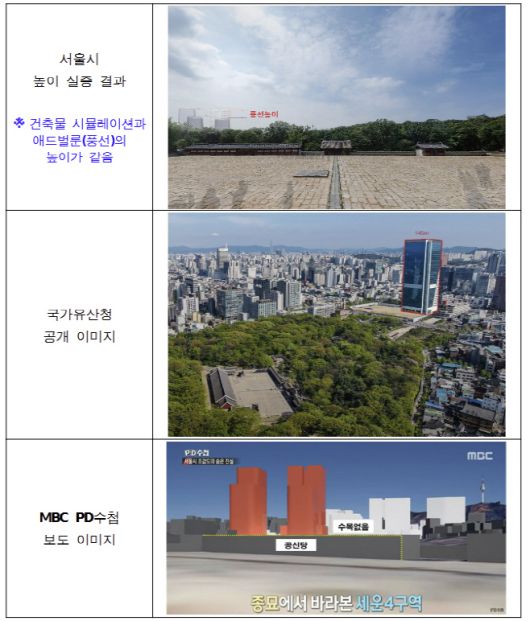 이민경 시 대변인은 20일 '국가유산청은 여론 선동을 멈추고 세운4구역 공동실측에 조속히 나설 것을 촉구합니다'라는 제목의 입장문을 내고 "국가유산청은 서울시의 객관적이고 공개적인 검증을 위한 공동 실측을 거부할 뿐만 아니라 세운4구역 건축물 높이 검증을 위해 건축물과 동일한 높이에 설치한 애드벌룬을 종묘에서 촬영하겠다는 서울시의 요청까지 불허했다"며 "이는 명백한 권한 남용"이라고 비판했다.