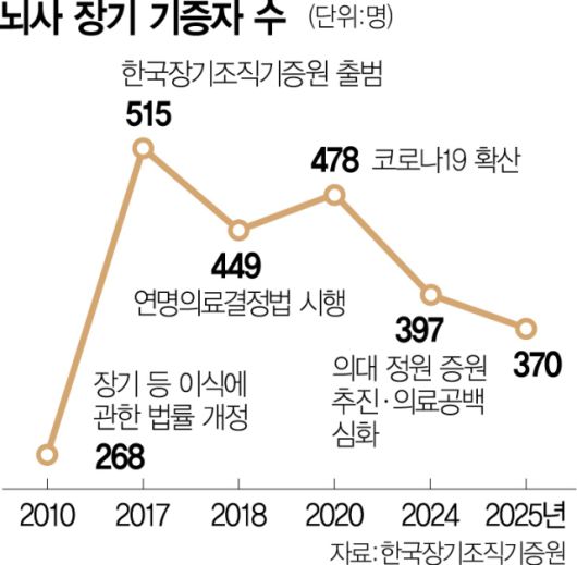 20일 한국장기조직기증원에 따르면 2025년 뇌사 장기 기증자는 370명으로 전년 397명 대비 6.8%(27명) 줄었다. 2024년에 2011년(368명) 이후 처음으로 300명대로 내려앉은 데 이어 기증자가 더 감소하면서 14년 전 수준으로 후퇴한 것이다.