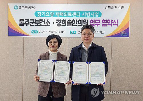 (울산=연합뉴스) 울산 울주군보건소는 20일 경희솔한의원과 장기요양 재택의료센터 시범사업 업무협약을 체결했다. 이 사업은 의사, 간호사, 사회복지사가 한 팀으로 장기요양보험 수급자의 가정을 방문해 의료서비스를 제공하고, 필요한 지역사회 돌봄서비스 등을 연계하는 것이다. 2026.1.20 [울주군 제공.재판매 및 DB 금지]