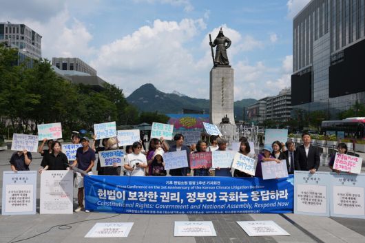 ‘기후 헌법소원’을 제기했던 ‘청소년기후소송’, ‘시민기후소송’, ‘아기기후소송’, ‘탄소중립기본계획 헌법소원’ 청구인들과 변호인단이 지난해 8월27일 서울 광화문광장에서 헌법재판소 결정 1주년을 맞아 기자회견을 하고 있다. ‘기후 헌법소원’ 청구인·변호인단 제공 |