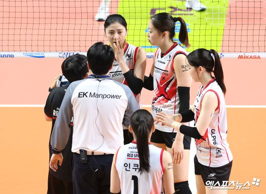 (엑스포츠뉴스 장충, 고아라 기자) 20일 오후 서울 장충체육관에서 열린 '진에어 2025-2026 V-리그' GS칼텍스와 정관장의 경기, 정관장 박혜민이 부상을 확인하고 있다.고아라 기자 iknow@xportsnews.com