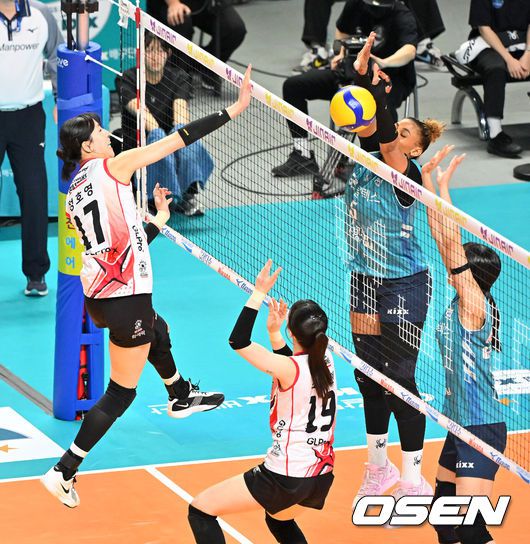 [OSEN=장충, 지형준 기자] 20일 오후 서울 장충체육관에서 프로배구 진에어 2025~26 V리그 GS칼텍스와 정관장의 경기가 열렸다. GS칼텍스는 5위(10승 12패, 승점 30), 정관장은 최하위(6승 17패, 승점 18)을 기록중이다. 1세트 GS칼텍스 실바가 정관장 정호영의 속공을 블로킹으로 막아내고 있다. 2026.01.20 / jpnews@osen.co.kr