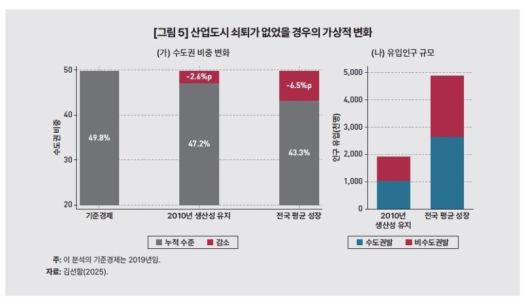 만약 이들 산업도시의 생산성이 하락하지 않고 2010년 수준을 유지했다면 2019년 수도권 인구 비중은 실제(49.8%)보다 2.6%p 낮은 47.2%에 머물렀을 것으로 추산됐다.