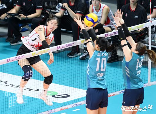 (엑스포츠뉴스 장충, 고아라 기자) 20일 오후 서울 장충체육관에서 열린 '진에어 2025-2026 V-리그' GS칼텍스와 정관장의 경기, GS칼텍스가 세트스코어 3:0(25-19, 25-22, 25-14) 셧아웃 승리를 거뒀다. 정관장 인쿠시가 공격을 시도하고 있다. 고아라 기자 iknow@xportsnews.com