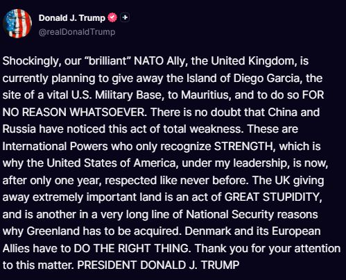 트럼프 대통령은 20일(현지시간) SNS(소셜미디어) 트루스소셜을 통해 "충격적이게도 우리 '멋진' 나토(NATO·북대서양조약기구) 동맹국인 영국은 정당한 이유 없이 현재 중대한 미군 기지가 있는 (차고스 제도) 디에고 가르시아 섬을 모리셔스에 넘길 계획을 세우고 있다"며 이를 미국이 그린란드를 확보해야 하는 이유 중 하나라고 주장했다.