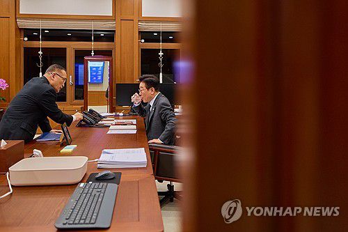 (서울=연합뉴스) 대통령실은 이재명 대통령이 20일 청와대 여민관 집무실에서 위성락 국가안보실장과 대화하는 모습을 SNS에 공개했다. 2026.1.20 [이재명 대통령 SNS. 재판매 및 DB 금지]